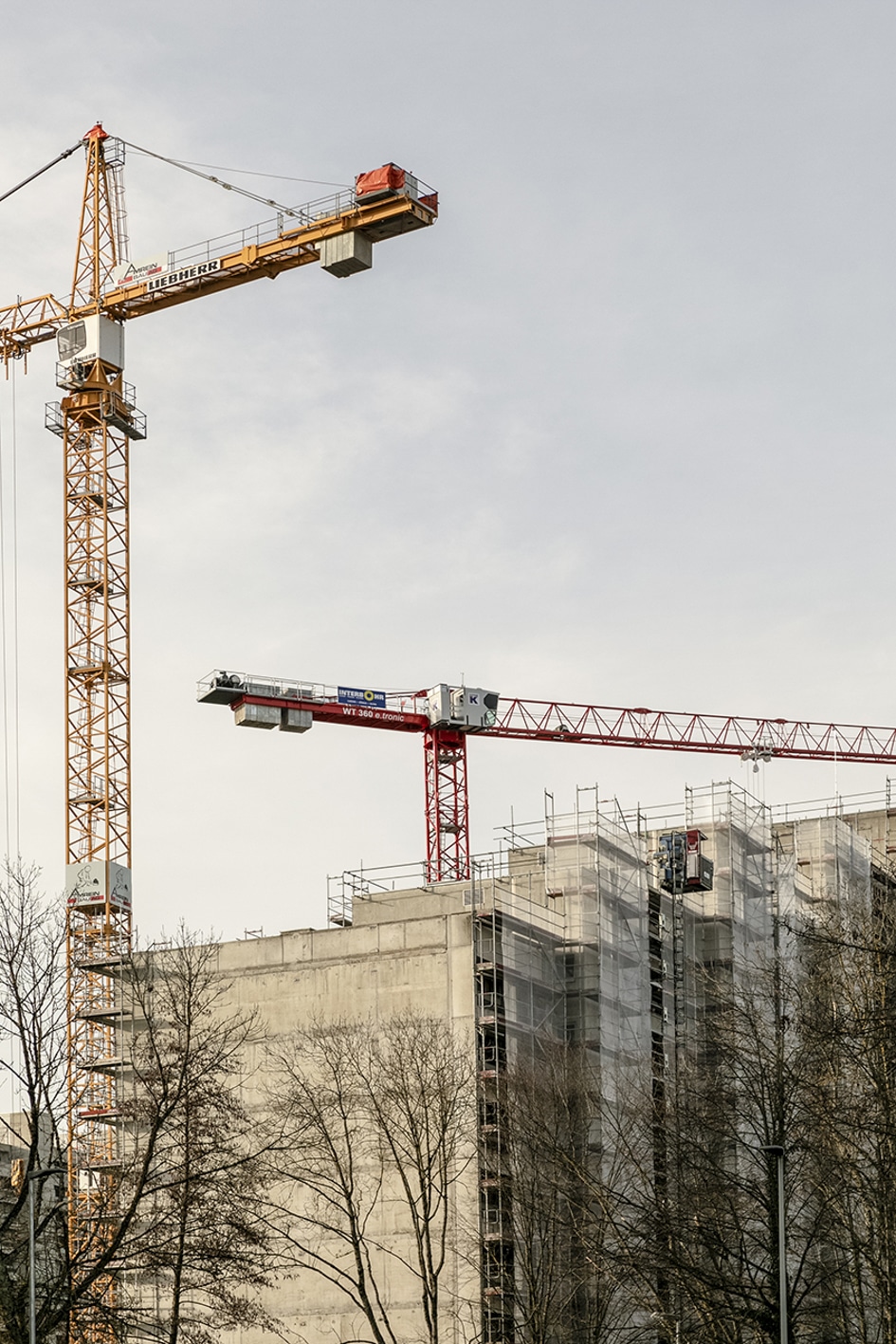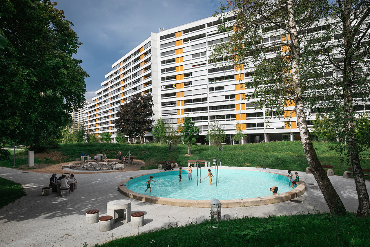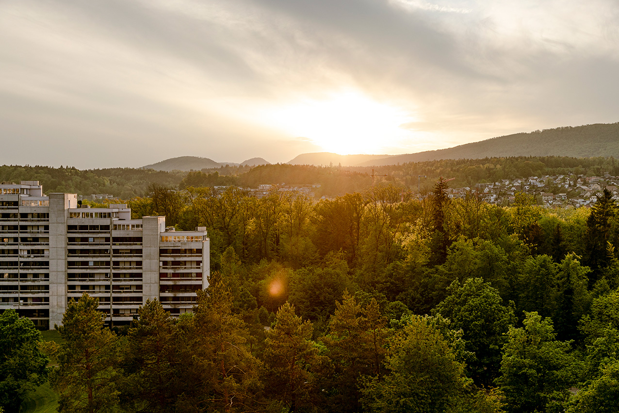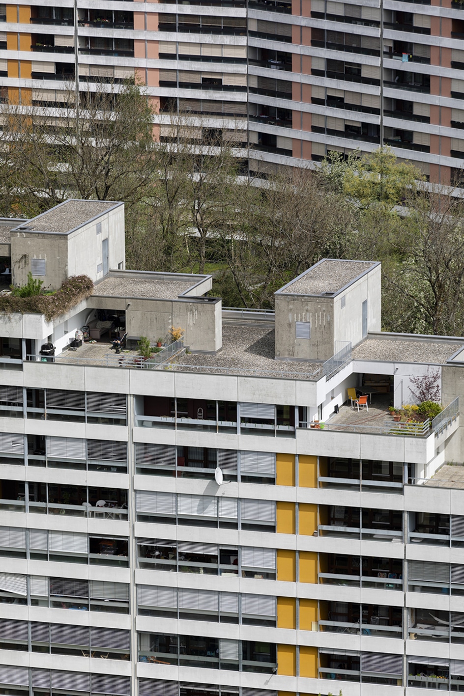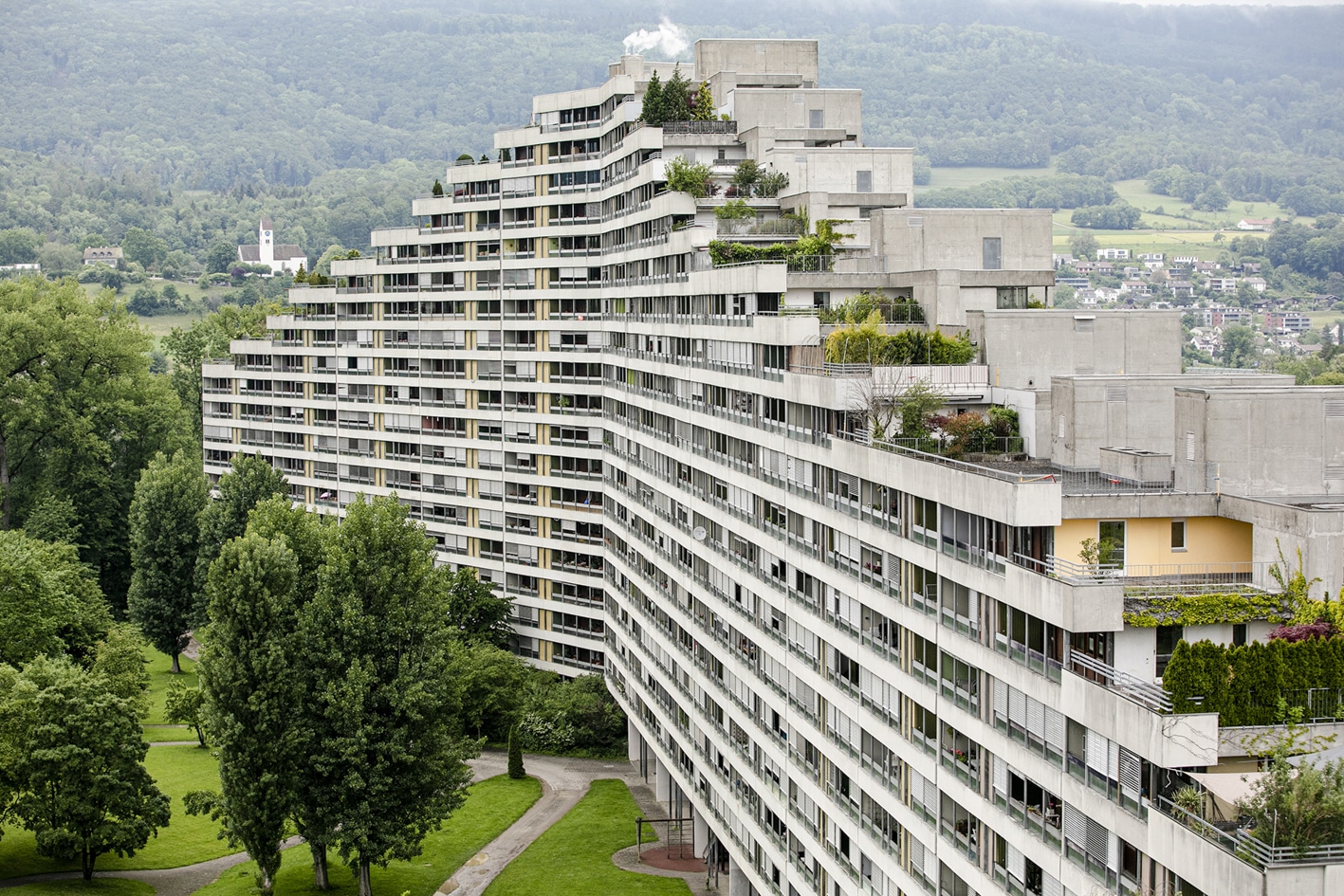 Östlich der Aarauer Altstadt zieht sich die aus vier lang gestreckten Gebäuden bestehende Grosswohnsiedlung durch die Landschaft.